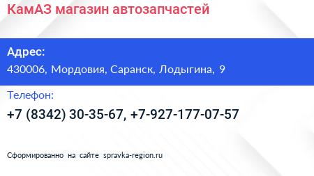 КамАЗ, магазин автозапчастей по адресу 430006, Мордовия, Саранск, Лодыгина, 9 в дальнейшем Организация, размещена в следующих категориях: