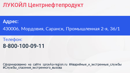 ЛУКОЙЛ-Центрнефтепродукт по адресу 430006, Мордовия, Саранск, Промышленная 2-я, 36/1 в дальнейшем Организация, размещена в следующих категориях: