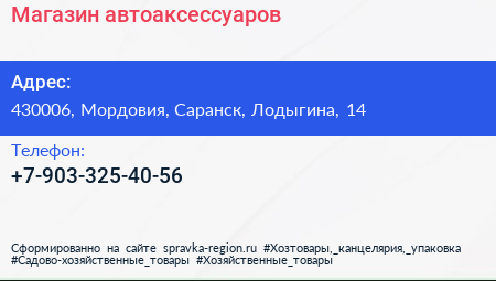 Магазин автоаксессуаров по адресу 430006, Мордовия, Саранск, Лодыгина, 14 в дальнейшем Организация, размещена в следующих категориях: