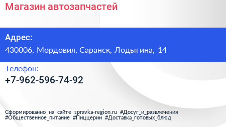 Магазин автозапчастей по адресу 430006, Мордовия, Саранск, Лодыгина, 14 в дальнейшем Организация, размещена в следующих категориях:
