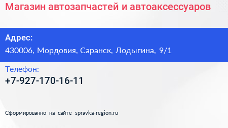 Магазин автозапчастей и автоаксессуаров по адресу 430006, Мордовия, Саранск, Лодыгина, 9/1 в дальнейшем Организация, размещена в следующих категориях: