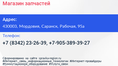 Магазин запчастей по адресу 430003, Мордовия, Саранск, Рабочая, 95а в дальнейшем Организация, размещена в следующих категориях: