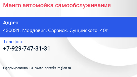 Манго, автомойка самообслуживания по адресу 430031, Мордовия, Саранск, Сущинского, 40г в дальнейшем Организация, размещена в следующих категориях: