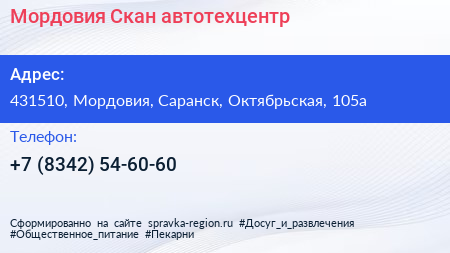 Мордовия Скан, автотехцентр по адресу 431510, Мордовия, Саранск, Октябрьская, 105а в дальнейшем Организация, размещена в следующих категориях: