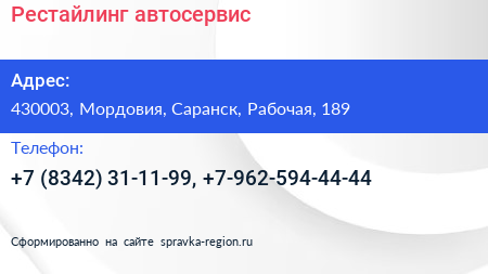 Рестайлинг, автосервис по адресу 430003, Мордовия, Саранск, Рабочая, 189 в дальнейшем Организация, размещена в следующих категориях: