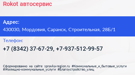 Rokot, автосервис по адресу 430030, Мордовия, Саранск, Строительная, 28Б/1 в дальнейшем Организация, размещена в следующих категориях: