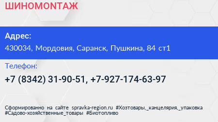 ШИНОМОNТАЖ по адресу 430034, Мордовия, Саранск, Пушкина, 84 ст1 в дальнейшем Организация, размещена в следующих категориях: