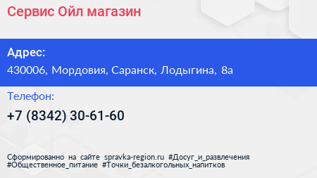 Сервис Ойл, магазин по адресу 430006, Мордовия, Саранск, Лодыгина, 8а в дальнейшем Организация, размещена в следующих категориях: