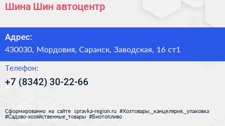 Шина Шин, автоцентр по адресу 430030, Мордовия, Саранск, Заводская, 16 ст1 в дальнейшем Организация, размещена в следующих категориях: