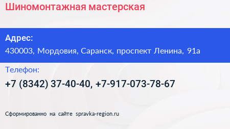 Шиномонтажная мастерская по адресу 430003, Мордовия, Саранск, проспект Ленина, 91а в дальнейшем Организация, размещена в следующих категориях: