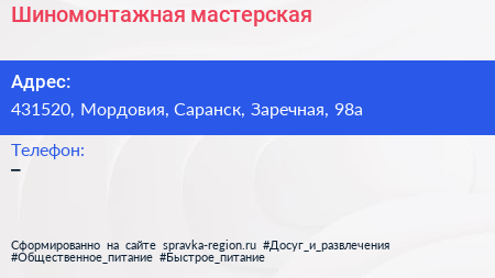 Шиномонтажная мастерская по адресу 431520, Мордовия, Саранск, Заречная, 98а в дальнейшем Организация, размещена в следующих категориях: