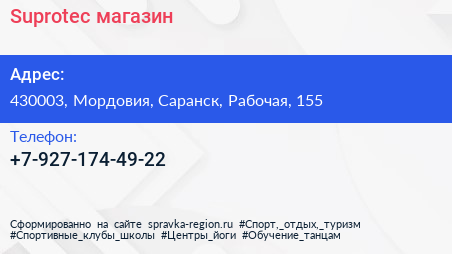 Suprotec, магазин по адресу 430003, Мордовия, Саранск, Рабочая, 155 в дальнейшем Организация, размещена в следующих категориях: