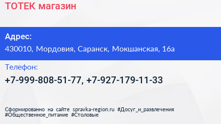 ТОТЕК, магазин по адресу 430010, Мордовия, Саранск, Мокшанская, 16а в дальнейшем Организация, размещена в следующих категориях: