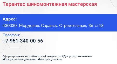 Тарантас, шиномонтажная мастерская по адресу 430030, Мордовия, Саранск, Строительная, 36 ст13 в дальнейшем Организация, размещена в следующих категориях: