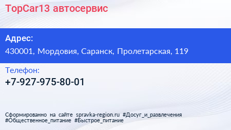 TopCar13, автосервис по адресу 430001, Мордовия, Саранск, Пролетарская, 119 в дальнейшем Организация, размещена в следующих категориях: