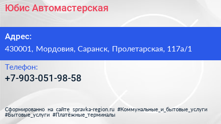 Юбис, Автомастерская по адресу 430001, Мордовия, Саранск, Пролетарская, 117а/1 в дальнейшем Организация, размещена в следующих категориях: