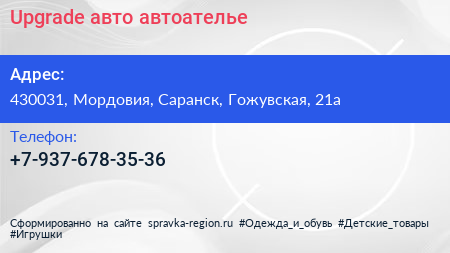 Upgrade авто, автоателье по адресу 430031, Мордовия, Саранск, Гожувская, 21а в дальнейшем Организация, размещена в следующих категориях: