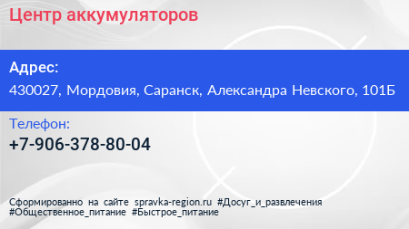 Центр аккумуляторов по адресу 430027, Мордовия, Саранск, Александра Невского, 101Б в дальнейшем Организация, размещена в следующих категориях: