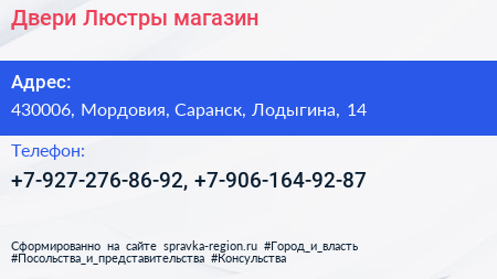 Двери & Люстры, магазин по адресу 430006, Мордовия, Саранск, Лодыгина, 14 в дальнейшем Организация, размещена в следующих категориях:
