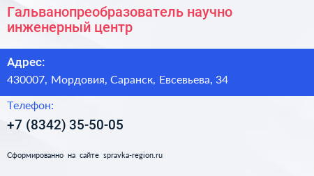 Гальванопреобразователь, научно-инженерный центр по адресу 430007, Мордовия, Саранск, Евсевьева, 34 в дальнейшем Организация, размещена в следующих категориях: