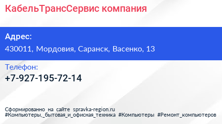 КабельТрансСервис, компания по адресу 430011, Мордовия, Саранск, Васенко, 13 в дальнейшем Организация, размещена в следующих категориях: