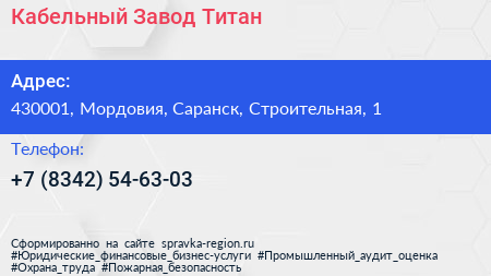 Кабельный Завод Титан по адресу 430001, Мордовия, Саранск, Строительная, 1 в дальнейшем Организация, размещена в следующих категориях: