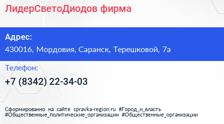 ЛидерСветоДиодов, фирма по адресу 430016, Мордовия, Саранск, Терешковой, 7а в дальнейшем Организация, размещена в следующих категориях: