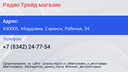 Радио-Трейд, магазин по адресу 430005, Мордовия, Саранск, Рабочая, 34 в дальнейшем Организация, размещена в следующих категориях:
