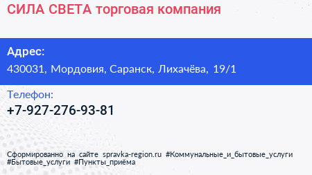 СИЛА СВЕТА, торговая компания по адресу 430031, Мордовия, Саранск, Лихачёва, 19/1 в дальнейшем Организация, размещена в следующих категориях: