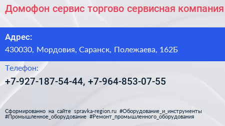 Домофон сервис, торгово-сервисная компания по адресу 430030, Мордовия, Саранск, Полежаева, 162Б в дальнейшем Организация, размещена в следующих категориях: