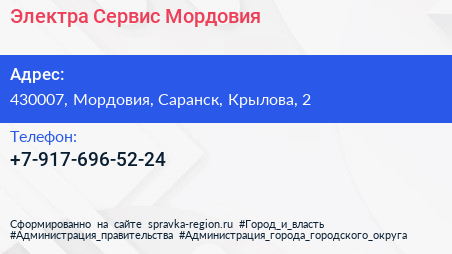 Электра Сервис-Мордовия по адресу 430007, Мордовия, Саранск, Крылова, 2 в дальнейшем Организация, размещена в следующих категориях: