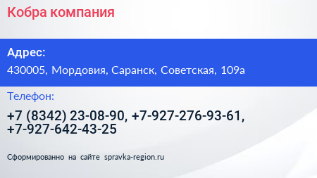 Кобра, компания по адресу 430005, Мордовия, Саранск, Советская, 109а в дальнейшем Организация, размещена в следующих категориях: