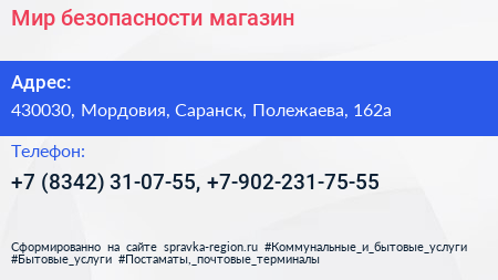 Мир безопасности, магазин по адресу 430030, Мордовия, Саранск, Полежаева, 162а в дальнейшем Организация, размещена в следующих категориях: