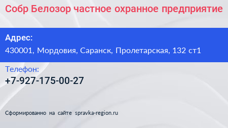 Собр Белозор, частное охранное предприятие по адресу 430001, Мордовия, Саранск, Пролетарская, 132 ст1 в дальнейшем Организация, размещена в следующих категориях: