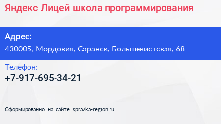 Яндекс.Лицей, школа программирования по адресу 430005, Мордовия, Саранск, Большевистская, 68 в дальнейшем Организация, размещена в следующих категориях:
