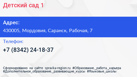 Детский сад №1 по адресу 430005, Мордовия, Саранск, Рабочая, 7 в дальнейшем Организация, размещена в следующих категориях: