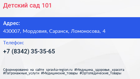 Детский сад №101 по адресу 430007, Мордовия, Саранск, Ломоносова, 4 в дальнейшем Организация, размещена в следующих категориях: