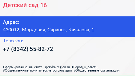 Детский сад №16 по адресу 430012, Мордовия, Саранск, Качалова, 1 в дальнейшем Организация, размещена в следующих категориях: