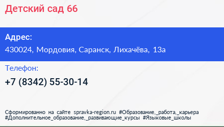 Детский сад №66 по адресу 430024, Мордовия, Саранск, Лихачёва, 13а в дальнейшем Организация, размещена в следующих категориях: