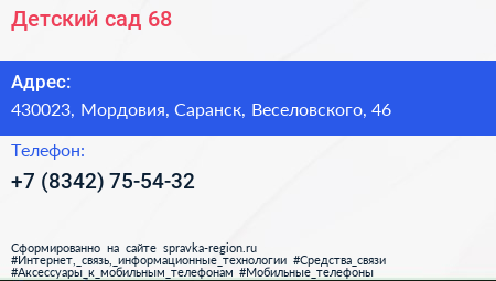 Детский сад №68 по адресу 430023, Мордовия, Саранск, Веселовского, 46 в дальнейшем Организация, размещена в следующих категориях: