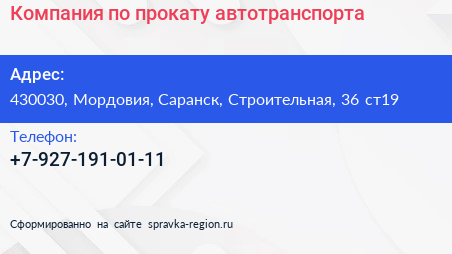Компания по прокату автотранспорта по адресу 430030, Мордовия, Саранск, Строительная, 36 ст19 в дальнейшем Организация, размещена в следующих категориях: