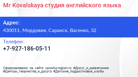 Mr.Kovalskaya, студия английского языка по адресу 430011, Мордовия, Саранск, Васенко, 32 в дальнейшем Организация, размещена в следующих категориях: