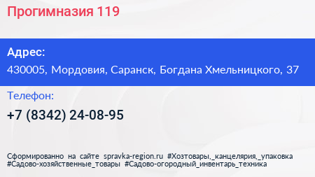 Прогимназия №119 по адресу 430005, Мордовия, Саранск, Богдана Хмельницкого, 37 в дальнейшем Организация, размещена в следующих категориях: