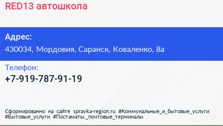 RED13, автошкола по адресу 430034, Мордовия, Саранск, Коваленко, 8а в дальнейшем Организация, размещена в следующих категориях: