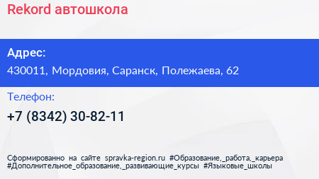 Rekord, автошкола по адресу 430011, Мордовия, Саранск, Полежаева, 62 в дальнейшем Организация, размещена в следующих категориях:
