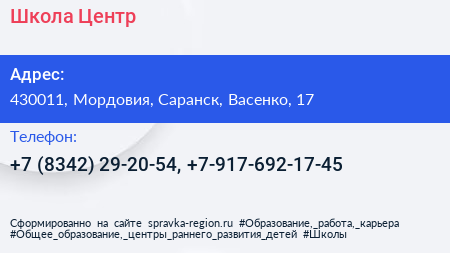 Школа-Центр по адресу 430011, Мордовия, Саранск, Васенко, 17 в дальнейшем Организация, размещена в следующих категориях: