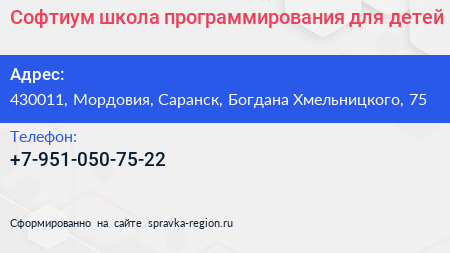 Софтиум, школа программирования для детей по адресу 430011, Мордовия, Саранск, Богдана Хмельницкого, 75 в дальнейшем Организация, размещена в следующих категориях:
