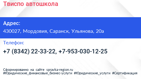 Твиспо, автошкола по адресу 430027, Мордовия, Саранск, Ульянова, 20а в дальнейшем Организация, размещена в следующих категориях: