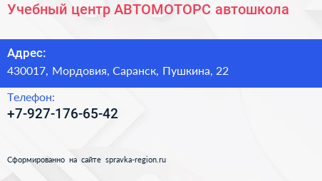 Учебный центр АВТОМОТОРС, автошкола по адресу 430017, Мордовия, Саранск, Пушкина, 22 в дальнейшем Организация, размещена в следующих категориях: