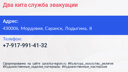 Два кита, служба эвакуации по адресу 430006, Мордовия, Саранск, Лодыгина, 8 в дальнейшем Организация, размещена в следующих категориях: